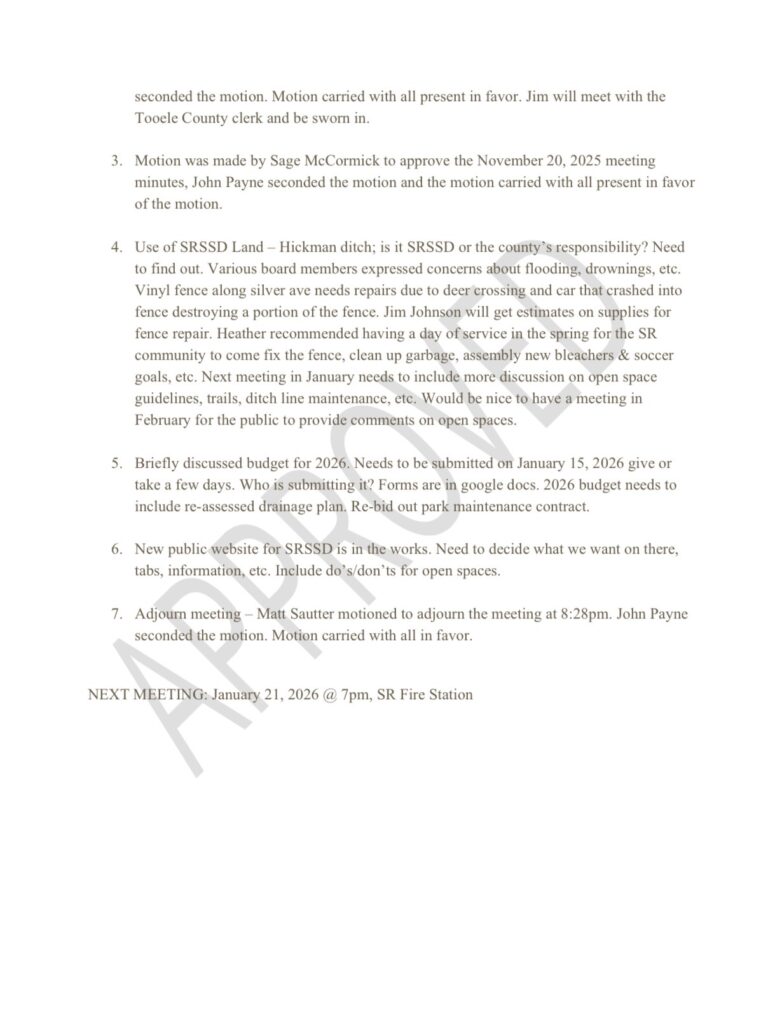 2026 SRSSD Board Meetings, always at 7pm at the SR fire station: